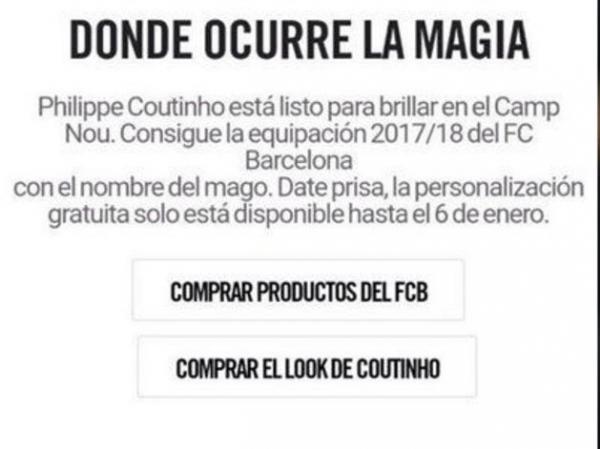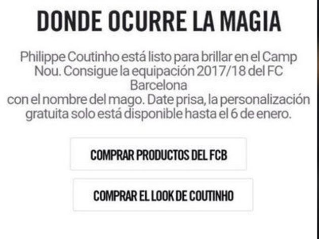 "Philippe Coutinho está pronto para brilhar no Camp Nou. Adquira o uniforme 2017/2018 do Barcelona com o nome do "mago". Não perca tempo, a personalização gratiuta só estará dispnível até dia 6 de janeiro".