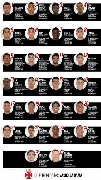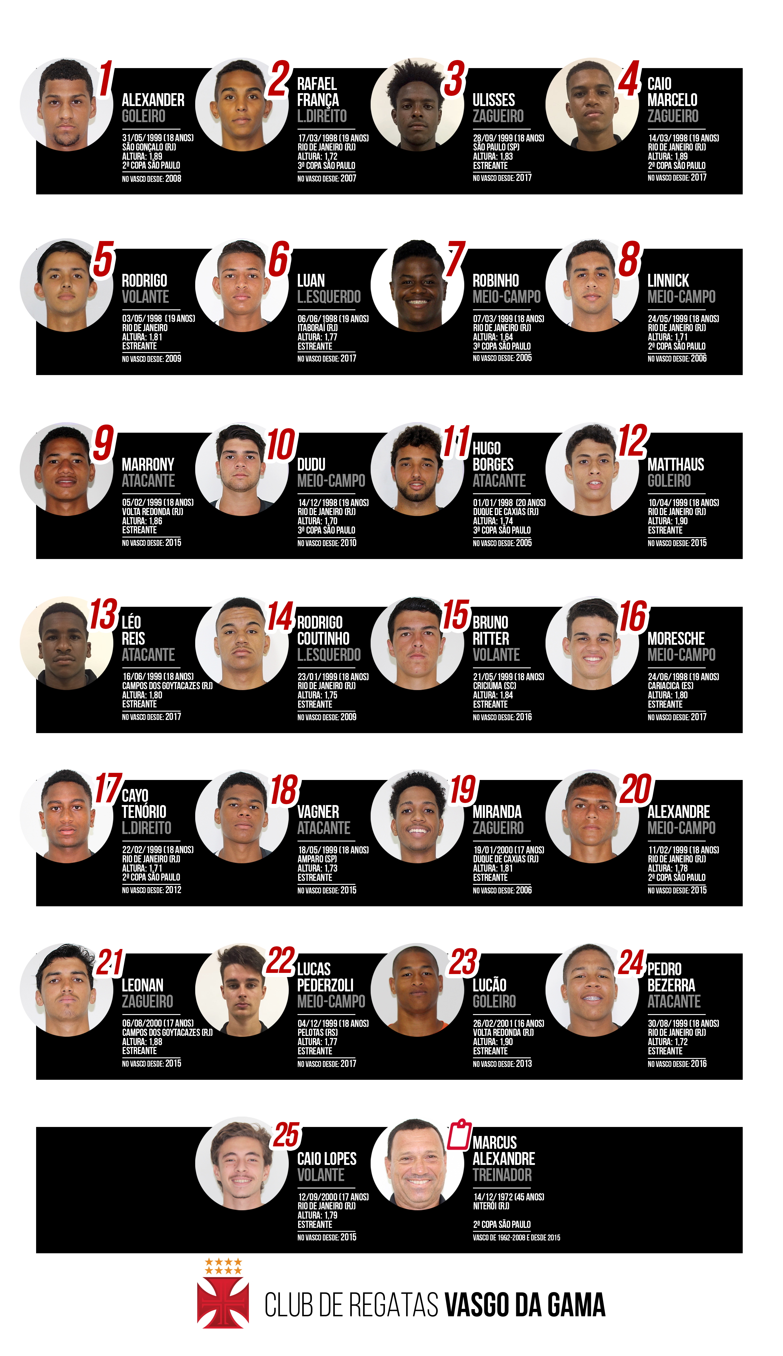 Sendo assim, a equipe vascaína será composta, em sua maioria, por jogadores da Geração 99, que acumula conquistas importantes durante a trajetória pela base do clube. O treinador Marcus Alexandre comandará o sub-20 pela segunda vez na Copa São Paulo e terá também à sua disposição alguns titulares do elenco campeão, casos de Rafael França, Ulisses, Dudu e Robinho. O artilheiro Hugo Borges, que conviveu com as lesões em 2017, também é opção.