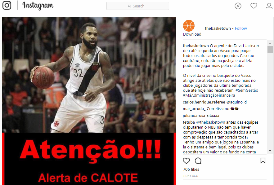 06/01/18 - Basquete: Agente de David Jackson espera que Vasco quite dívida até 2ª-feira