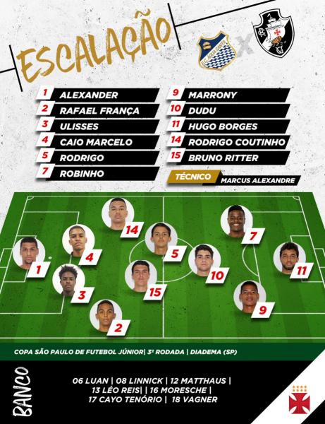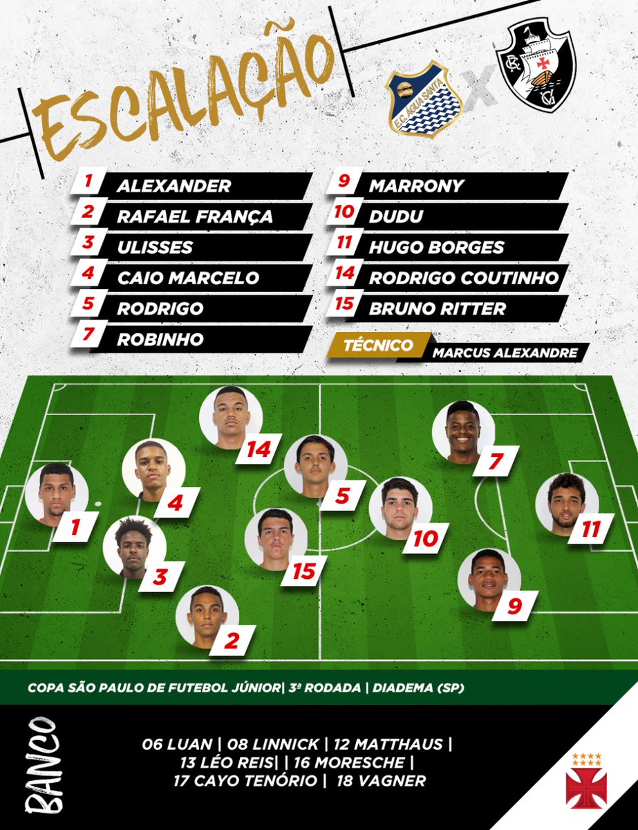 Juniores: Veja escalação do Vasco para o jogo contra o Água Santa