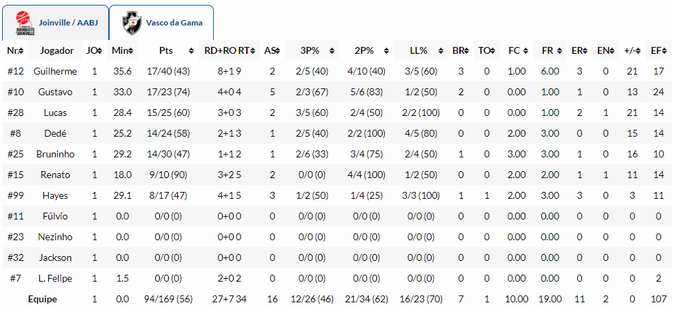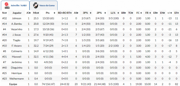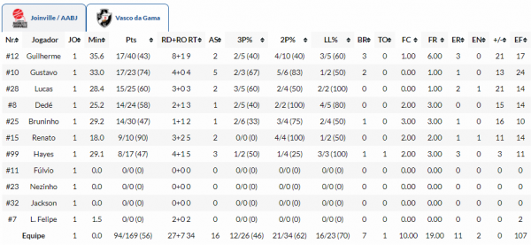 Com 17 pontos cada, os vascaínos Guilherme Giovannoni e Gustavo dividiram o status de cestinha da partida. Lucas Mariano (15 pontos) e Bruninho (14) foram outros jogadores de atuação destacada. Pelo lado do Joinville, Johnson fez 13 pontos, um a mais que o companheiro Bambu. O time catarinense segue em 13º, fora da zona de classificação ao playoff.