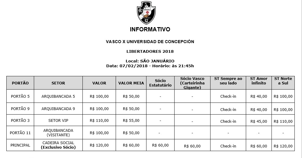 A venda de ingressos para a partida do Vasco contra o Universidad de Concepción, dia 7 de Fevereiro, em São Januário, começará na próxima quinta-feira, dia 11. A carga total é de 22 mil ingressos, sendo 19 mil e 500 à disposição dos torcedores e os demais incluem as gratuidades e os já reservados pela CONMEBOL - Confederação Sul Americana de Futebol.