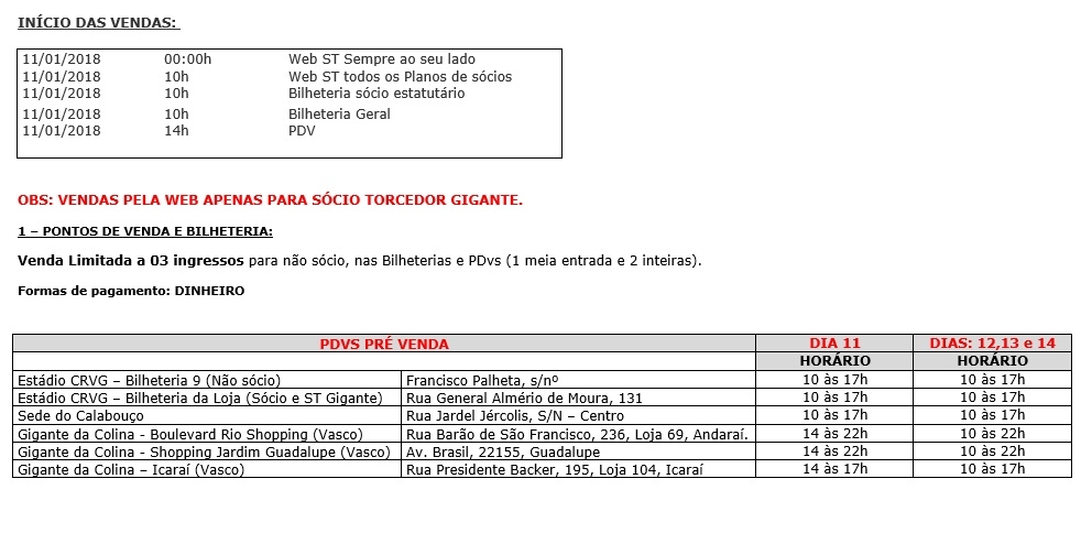 Vale ressaltar que a venda pela internet será exclusiva para Sócios-Torcedores ou Sócios Estatutários do Vasco que possuem a carteira do Gigante. Os pontos de São Januário e Calabouço começarão as vendas às 10 horas de quinta-feira. As três lojas credenciadas para esta partida iniciarão a comercialização dos ingressos às 14 horas.