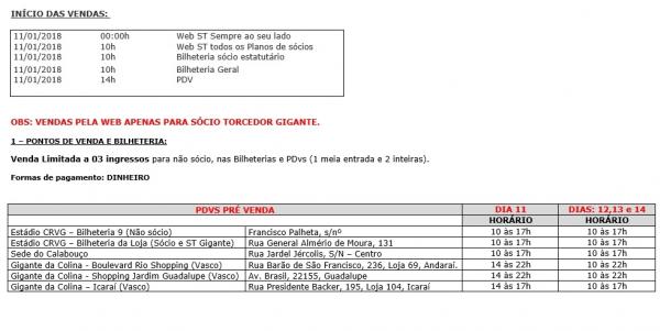 1. SÓCIO TORCEDOR GIGANTE – a venda de ingressos para os sócios-torcedores será feita exclusivamente pela FutebolCard ATRAVÉS DO SITE DO GIGANTE E NA BILHETERIA AO LADO DA MEGALOJA DE SÃO JANUÁRIO.