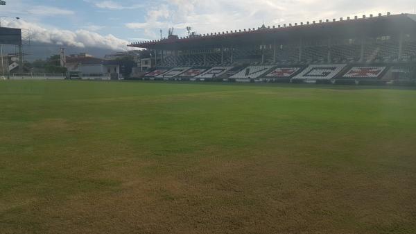 Gramado, aparentemente, em perfeito estado. A tintura preta da arquibancada foi retocada.