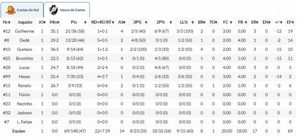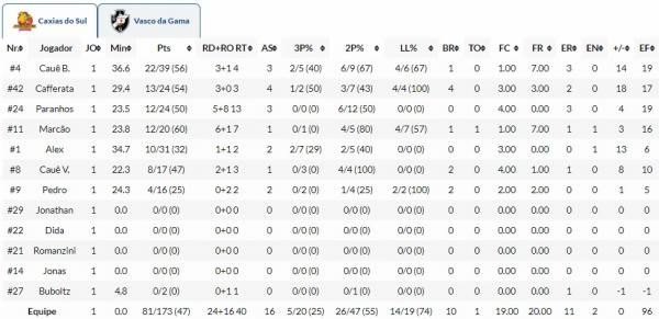 Com 22 pontos marcados, Cauê Borges foi o cestinha da partida desta quarta em Caxias do Sul. Pelo lado do Vasco, Guilherme Giovannoni pontuou 21 vezes, oito a mais que Dedé e 12 a mais que Gustavo. Com 13 pontos e 12 rebotes, Paranhos deixou a quadra com um duplo-duplo. Esta foi a oitava derrota do Vasco em 12 jogos disputados na temporada. O time ocupa a 11ª colocação na classificação da primeira fase.
