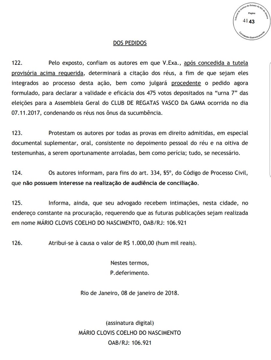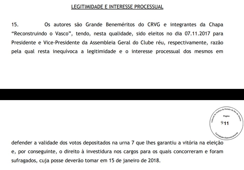 Os autores desta ação, no documento protocolado na 17a Vara, admitem que são integrantes da chapa de Eurico Miranda e se dizem eleitos presidente e vice da Assembleia Geral do Vasco #lanceVAS