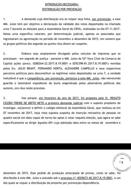 O documento tem um capítulo "distribuição por prevenção". Confira primeira parte do texto. Alegam que a primeira ação da eleição do Vasco foi da 17a e não da 52a, da juíza Maria Cecília #lanceVAS