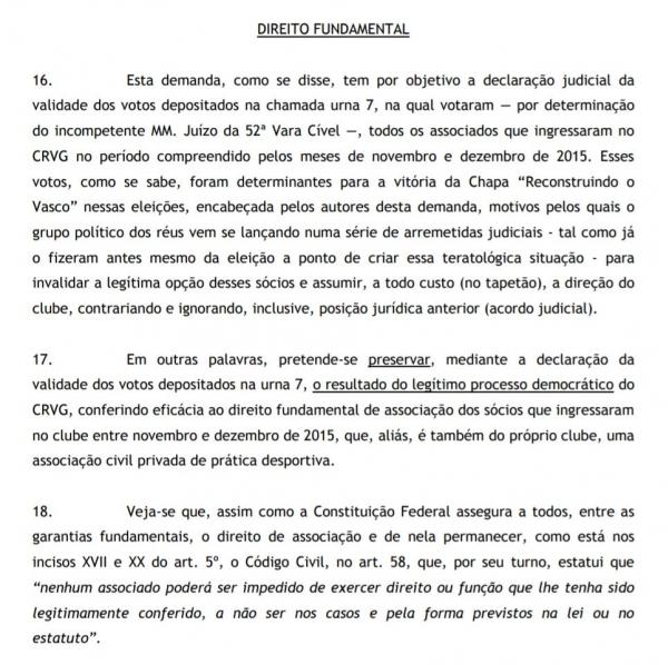 No início do tópico "direito fundamental" pedem a validade dos votos na urna 7 dizendo que os sócios votaram nela "por determinação do incompetente juízo da 52a Vara Cível" #lanceVAS