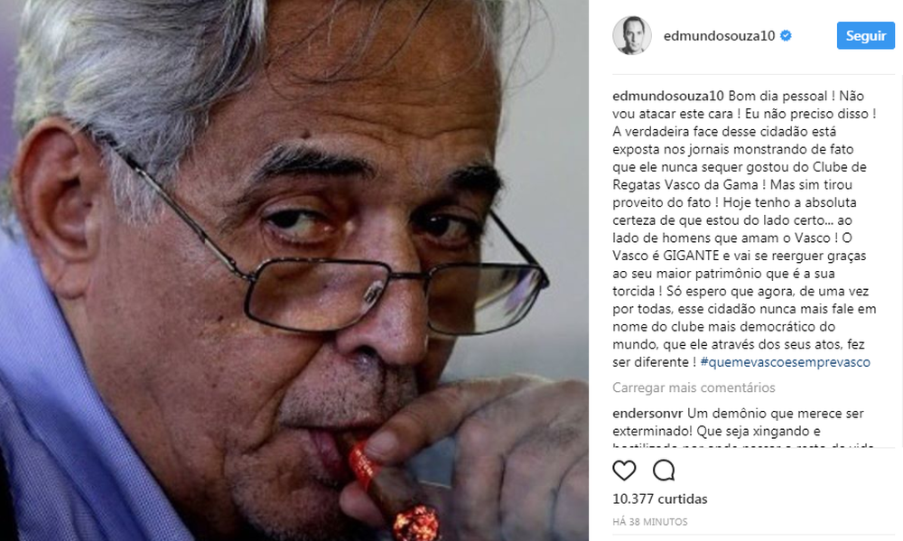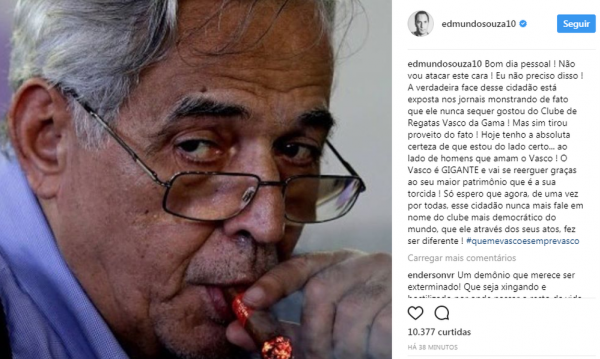 Com o mandato de Eurico Miranda se aproximando no fim, na próxima terça-feira, dia 16 de janeiro, Edmundo resolveu se pronunciar nas redes sociais e alfinetar o atual mandatário cruz-maltino. Aliado de Julio Brant - presidente da chapa "Sempre Vasco Livre" -, o "Animal" acusou Eurico de ter se beneficiado da posição de presidente do clube.