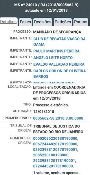 O departamento jurídico do Vasco entrou nesta sexta-feira com mandado de segurança no Superior Tribunal de Justiça, em Brasília, contra as decisões do Tribunal de Justiça do Estado do Rio. O clube tenta na última instância reverter a anulação dos votos da urna 7 da eleição de 7 de novembro, que dá a vitória a Julio Brant, da oposição.
