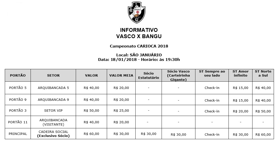Torcedores menores de 12 anos não pagam ingressos, apresentando documento de identificação (torcedores com 12 anos completos pagam ingresso).