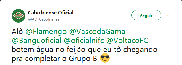 Em rede social, Cabofriense brinca e cita o Vasco: 'Botem água no feijão que eu tô chegando pra completar o Grupo B'
