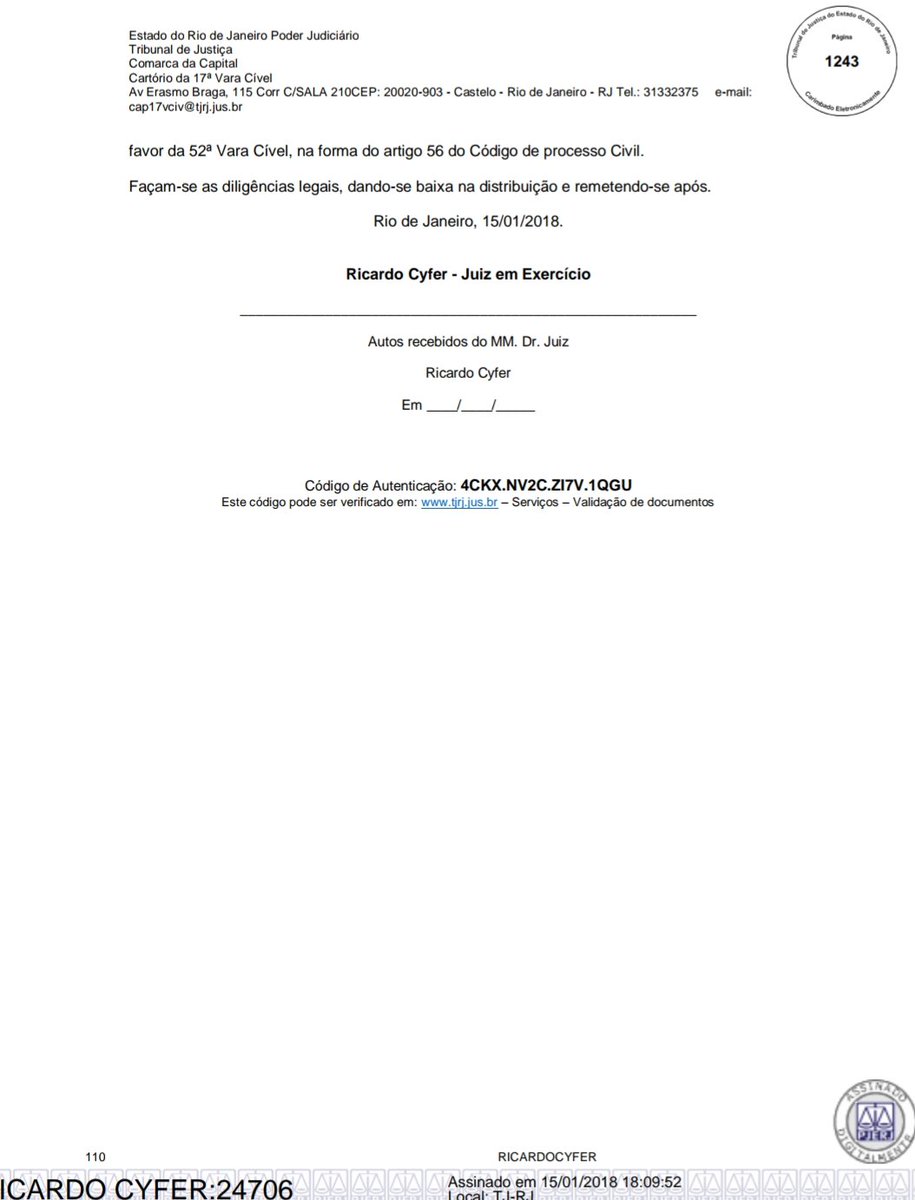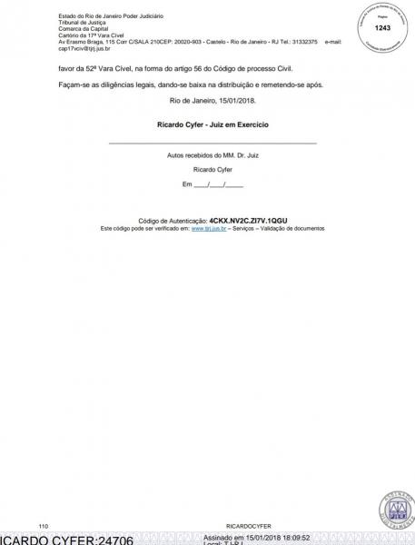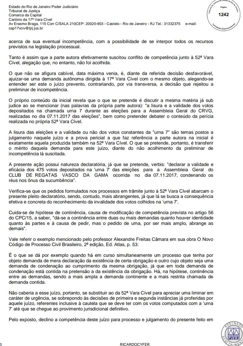 Juiz Ricardo Cyfer, da 17a Vara Cível do Tribunal de Justiça do Rio de Janeiro, declinou competência na ação impetrada semana passada por membros da situação pela urna 7. Mandou caso para a juíza Maria Cecília, da 52a Vara, já com o processo. Confira decisão na íntegra #lanceVAS