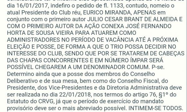 URGENTE! Juíza Maria Cecília Pinto Gonçalves, da 52a Vara Cível do Tribunal de Justiça do Rio de Janeiro, no período de vacância presidencial do Vasco até o dia da eleição e posse, nomeia Eurico Miranda, Julio Brant e Fernando Horta como administradores do clube #lanceVAS
