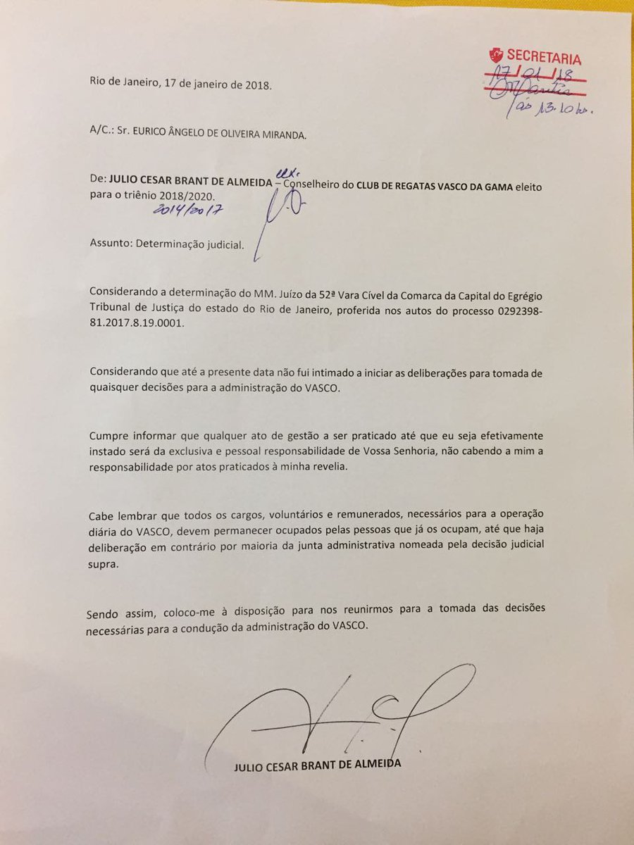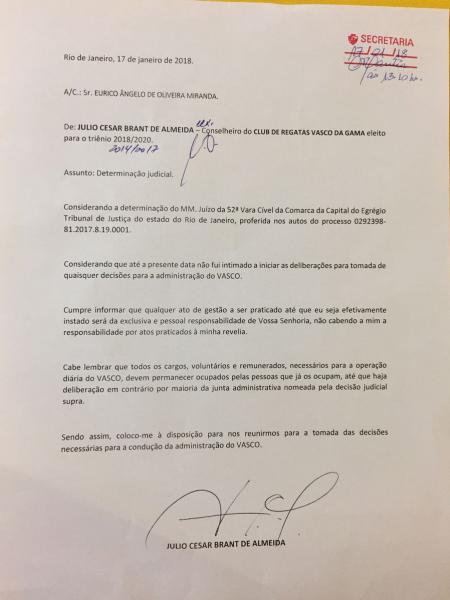 Confira a carta protocolada por Julio Brant na secretaria do Vasco nesta 4ª