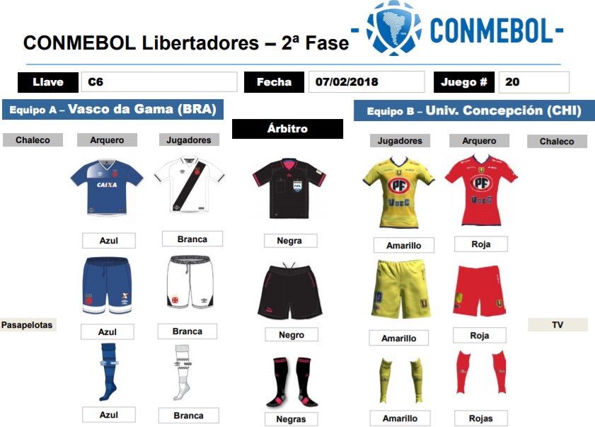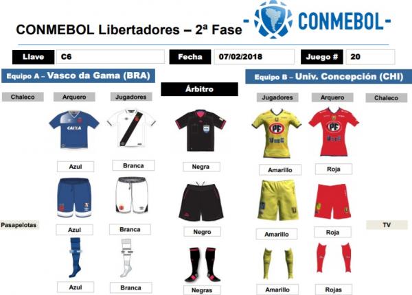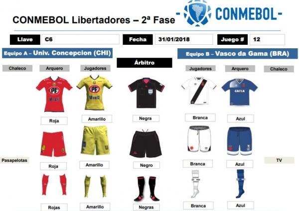 Já estão definidos os uniformes com os quais os times atuarão nas duas primeiras fases preliminares da Libertadores da América. O Vasco enfrentará o Universidad de Concepción com seu uniforme branco (goleiro de azul), enquanto o adversário jogará de amarelo (goleiro de vermelho). As partidas acontecem no dia 31/01 no Chile e no dia 07/02 em São Januário.