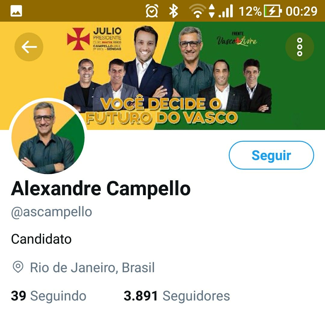 Curiosamente, Alexandre Campello ainda aparece ao lado de Julio Brant em seu perfil oficial de campanha no Twitter. Campello rompeu com Brant 24 horas antes da eleição para presidente do Vasco, se lançou candidato e derrotou o ex-aliado por 154 votos a 88.