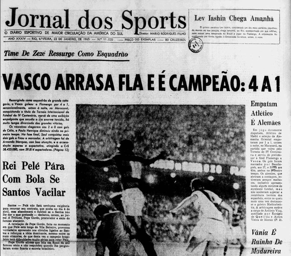 No dia 21 de janeiro de 1965, o Vasco deixava o urubu de 4 no Maracanã, e conquistava o título de campeão do IV Centenário da Cidade do Rio de Janeiro. Vale lembrar que cinquenta anos depois, em 2015, quando a cidade do Rio celebrou 450 anos, o campeão da cidade novamente foi o Gigante da Colina.