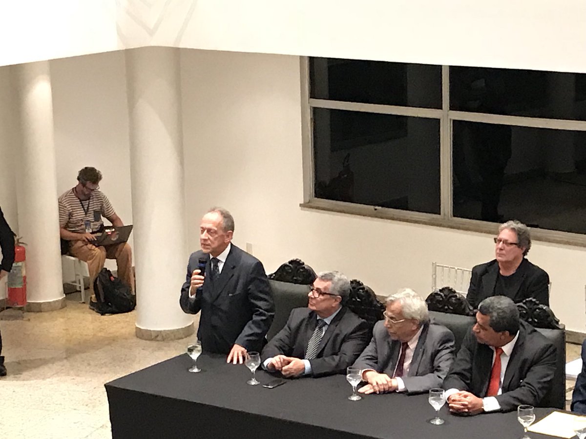 É a vez de Walter Feldman falar. Em nome da CBF agradece ao convite. Diz que a CBF estará ao lado pra contribuir pra mudança nesse momento. Fala da forma como foi a eleição. Diz que estão juntos na briga contra o autoritarismo e pela democracia.