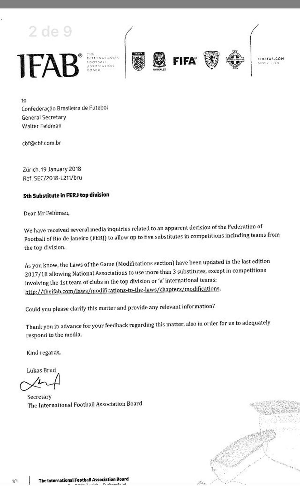 O Comitê Internacional das Associações de Futebol (IFAB), considerado o guardião das regras do futebol, não vai rever a decisão de impedir a Federação de Futebol do Estado do Rio de Janeiro (FERJ) de manter as cinco substituições em partidas do Campeonato Carioca. Por e-mail, o gerente de Comunicação e Administração do IFAB, Boudien Broekhuis, respondeu ao GloboEsporte.com que nenhuma medida adicional acontecerá, além daquela já tomada de alertar para a irregularidade na interpretação das leis, pedindo a revogação da permissão de cinco substituições.
