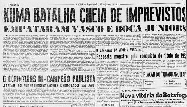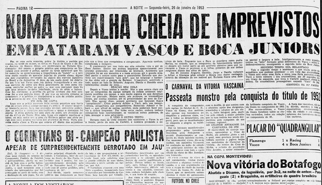 Há 65 anos, o Vasco empatava em 4 a 4 com o Boca Jrs na estreia do Quadrangular Internacional do RJ, que contava ainda com o Racing Club e o urubu.