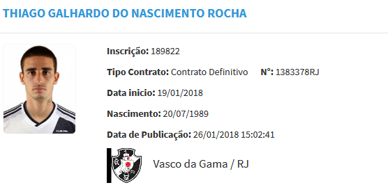 22/01/18 - Rescisão de Thiago Galhardo com o Coritiba é publicada no BID e meia pode ser registrado pelo Vasco