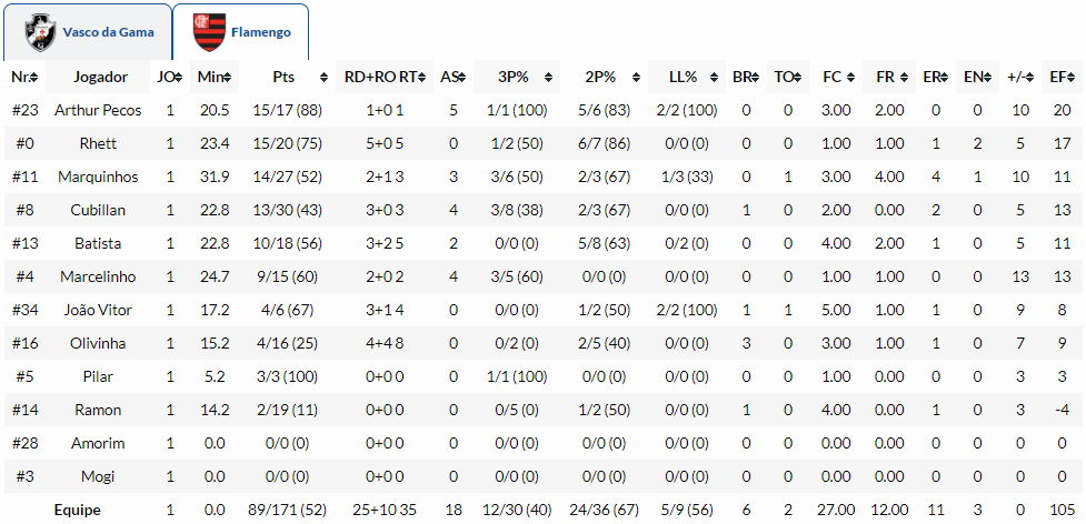 Flamengo: Cubillan, Ronald Ramon, Marquinhos, Olivinha e JP Batista. Suplentes: Rhett, Mogi, Marcelinho Machado, Pilar, Arthur Pecos, Amorim e João Vitor. Técnico: José Neto.