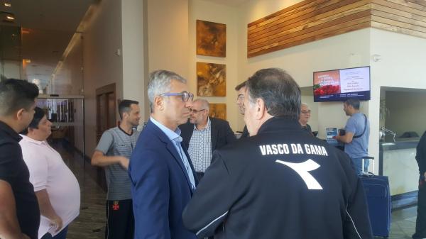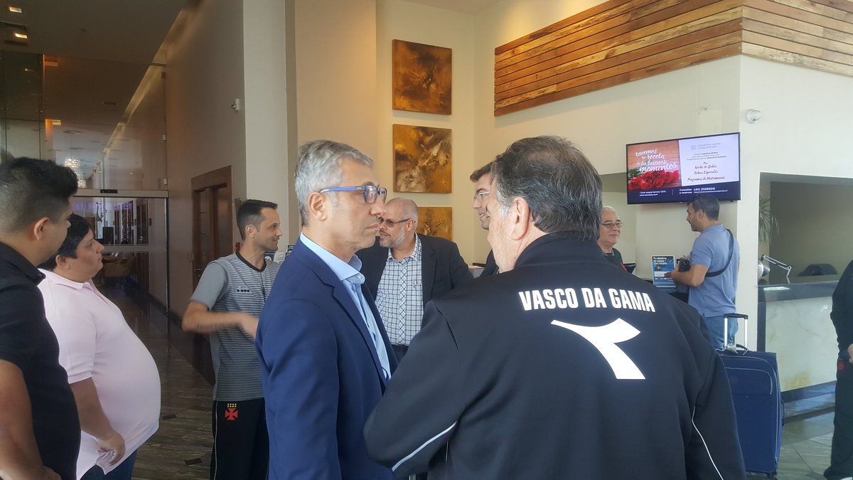 Campello acaba de chegar ao hotel do Vasco. Junto com ele, o VP de futebol, Fred Lopes, e o presidente do Conselho Deliberativo, Roberto Monteiro. #gevas