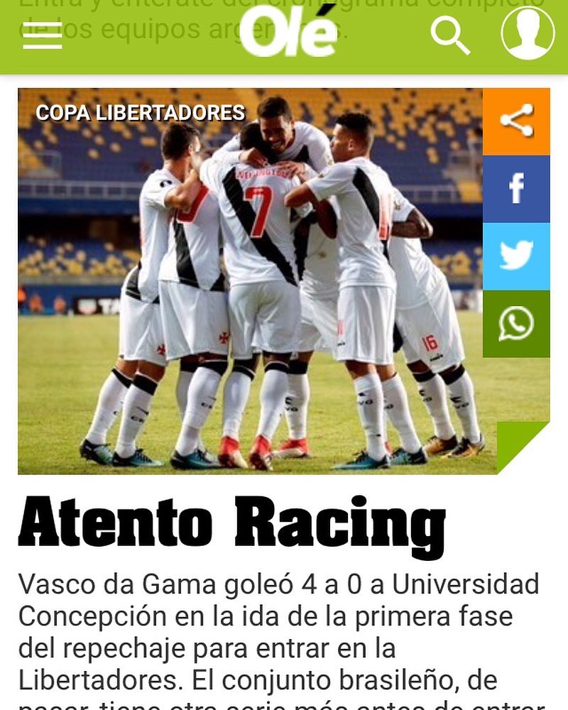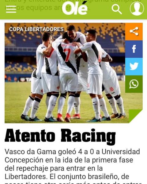 O jornal argentino Olé estampou, em seu site, a manchete "Atento Racing" após a goleada vascaína por 4 a 0 sobre o Universidad de Concepción pela Libertadores. Se o Vasco chegar à fase de grupos, terá a companhia de Racing, Cruzeiro e Universidad de Chile no Grupo 5.