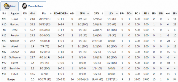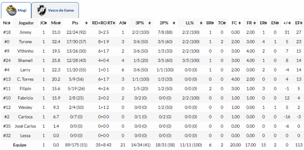 O cestinha da partida foi o ala Jimmy, do Mogi, com 22 pontos de 24 tentados. Pelo lado da equipe do técnico Guerrinha, destaque também para a atuação do ala-pivô Tyrone, com 17 pontos e nove rebotes. O principal pontuador do Vasco foi o pivô Lucas Mariano, com 20 tentos.