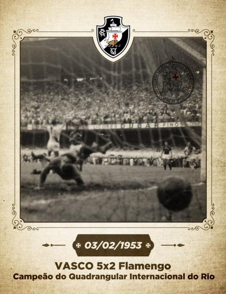 Há 65 anos, o Vasco conquistava o Quadrangular Internacional do Rio sobre o Flamengo. Após empatar em 4 a 4 com o Boca Juniors (ARG), e em 3 a 3 contra o Racing (ARG), o Gigante da Colina foi para o último jogo precisando vencer para levantar mais um troféu. Na partida decisiva, o Expresso da Vitória, de virada, goleou a equipe da Gávea por 5 a 2 e fez outra vez a alegria da imensa torcida vascaína!