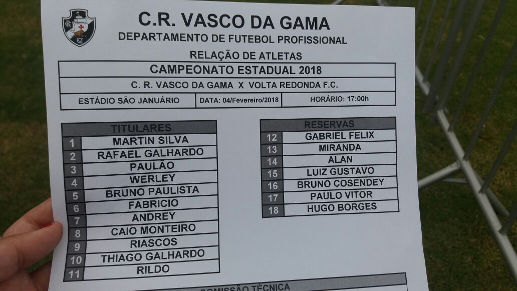 Confira a escalação do Vasco; Werley e Fabricio estreiam, Paulão reestreia
