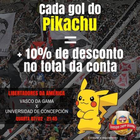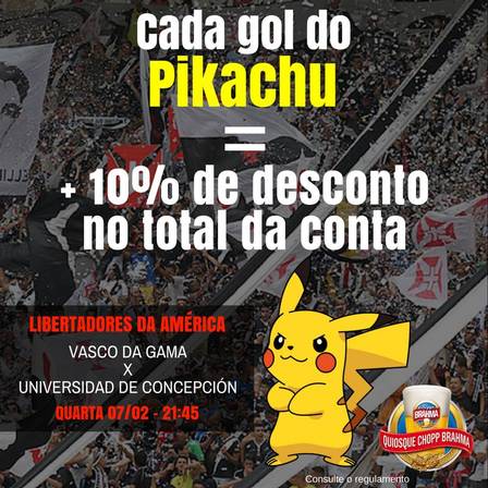 Um bar no no Centro do Rio de Janeiro fará uma promoção especial para os vascaínos no jogo desta quarta-feira, contra a Universidad Concepción, pela Pré-Libertadores. A cada gol o lateral-direito Yago Pikachu, o bar dará 10% de desconto sobre a conta.