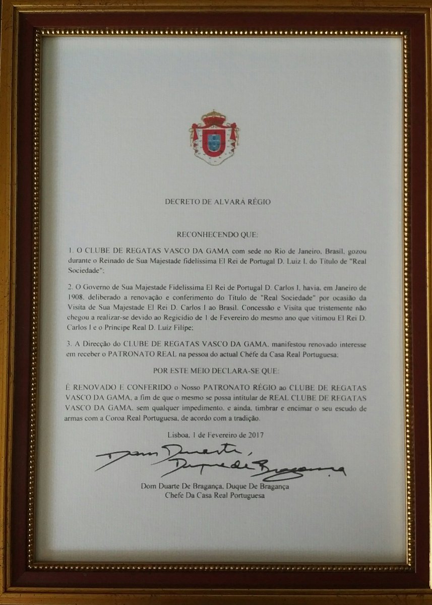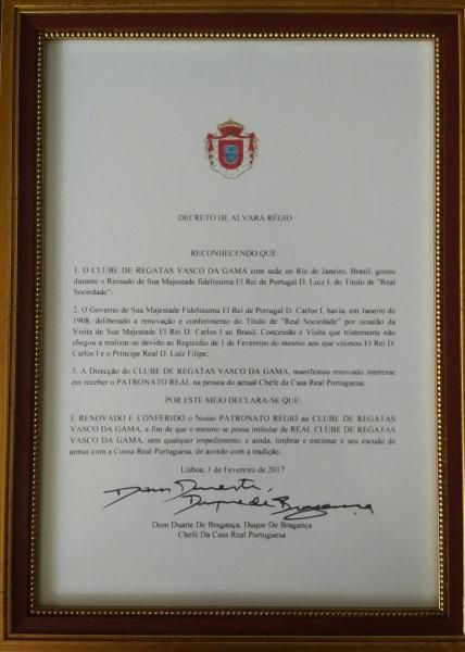Real Club de Regatas Vasco da Gama, um título que viria em 1908, com a visita do Rei Dom Carlos ao Brasil, mas impedido pelo regicídio de 01/02/1908. O tempo reparou a justa honraria nos 119 anos do Vasco, pelo Alvará Régio do Chefe da Casa Real Portuguesa, D. Duarte de Bragança