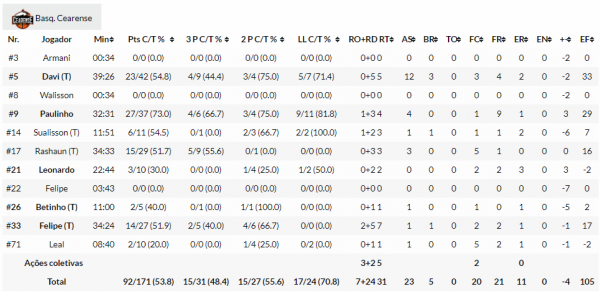 A partida começou equilibrada com as duas equipes buscando lances de infiltração. O pivô Renato serviu bem com assistências e fazendo jogadas curtas com Dedé. Mas o time de fortaleza estava firme na marcação e conferiu pontos de três, decisivos para ganharem o quarto, por 21 a 18. No segundo quarto o cruzmaltino melhorou a marcação, esteve à frente do placar boa parte do período, mas o adversário reagiu e terminou o primeiro tempo vencendo por 50 a 43.