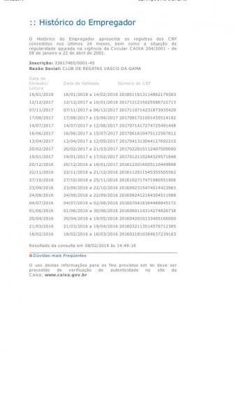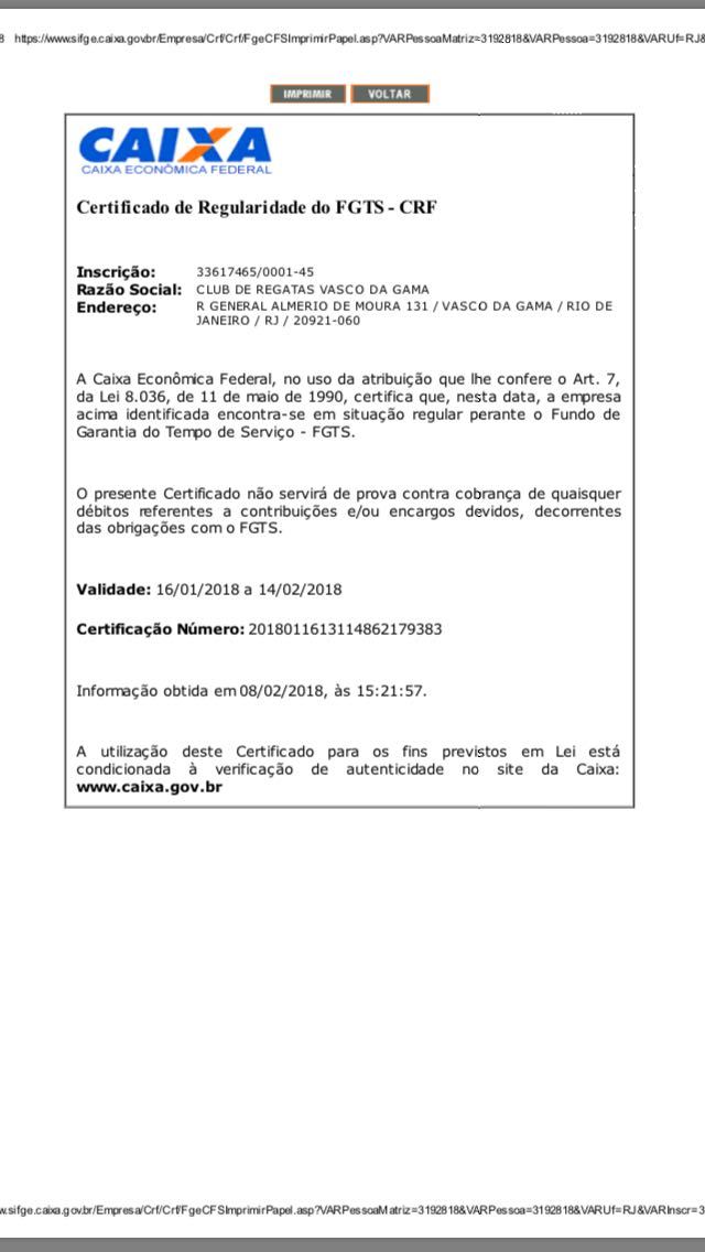 Casaca publica certificado de regularidade do FGTS do Vasco