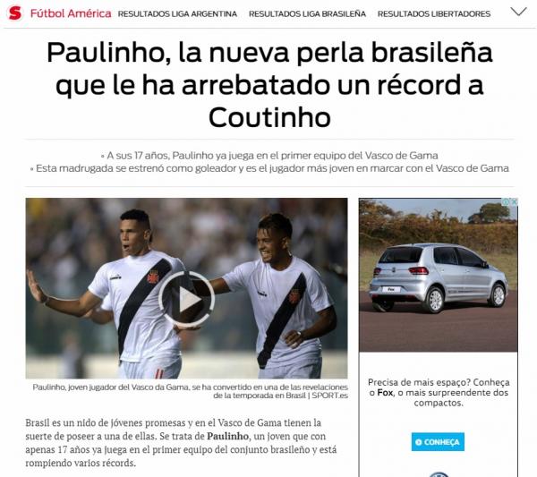 O site do jornal espanhol Sport destacou as últimas atuações do atacante vascaíno Paulinho, chamando-o de "a nova pérola brasileira". A publicação também informa que Paulinho superou Philippe Coutinho como jogador mais novo a marcar um gol pelo Gigante da Colina, e informa que tanto Barcelona quanto Real Madrid já o estariam monitorando. Leia a matéria original, em espanhol, .