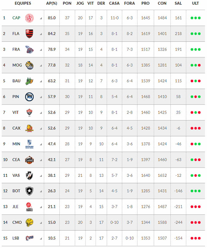 Após 21 de 28 jogos da fase regular do NBB, o Vasco está em 11º lugar por aproveitamento e em 9º por pontos. A classificação por pontos, no entanto, pode apresentar distorção porque o Gigante da Colina tem 2 jogos a mais do que quase todos os demais participantes.