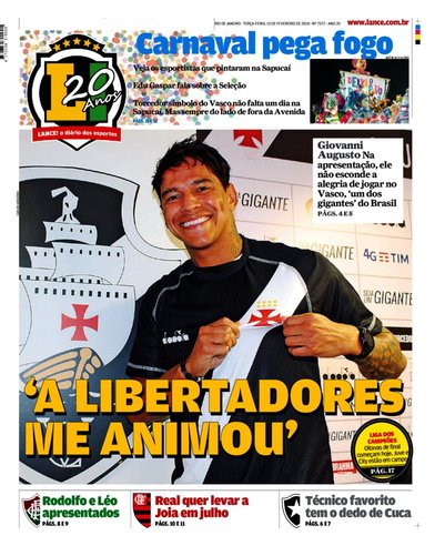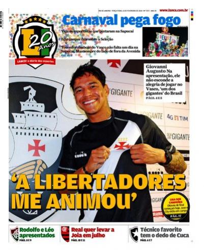 Apresentado na 2ª-feira de Carnaval, o meia-atacante Giovanni Augusto foi capa do jornal Lance nesta 3ª-feira.