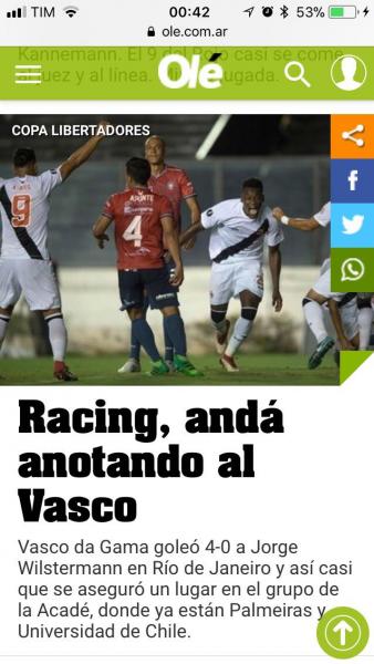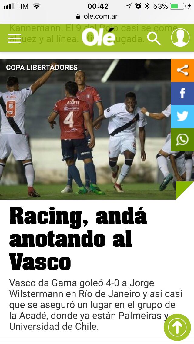 Após mais uma goleada do Vasco na Libertadores, desta vez contra o Jorge Wilstermann, o jornal argentino Olé voltou a chamar a atenção do Racing para a campanha do Gigante da Colina, a exemplo do que havia feito após a goleada vascaína contra o Univ. Concepción. Caso o Vasco chegue à fase de grupos, terá a companhia de Racing, Cruzeiro e Univ. de Chile.
