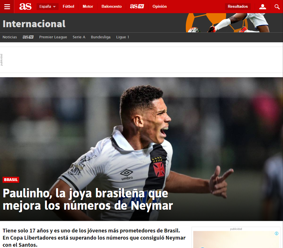 O jornal "As" destacou a performance do atacante Paulinho, do Vasco. O jovem de 17 anos voltou a brilhar na Libertadores. Desta vez, Paulinho anotou um gol na goleada contra o Jorge Wilstermann, por 4 a 0, em São Januário.