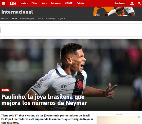 A publicação espanhola dá ênfase aos números alcançados por Paulinho com apenas 17 anos. O alvo para comparação é Neymar.