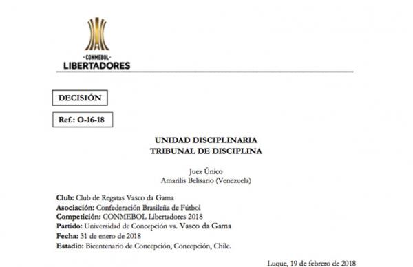 El Tribunal de Disciplina de la CONMEBOL aplicó una multa como sanción y una advertencia al Club de Regatas Vasco da Gama por la comisión de infracciones al Reglamento Disciplinario de la CONMEBOL y al Reglamento de la CONMEBOL LIBERTADORES 2018.
