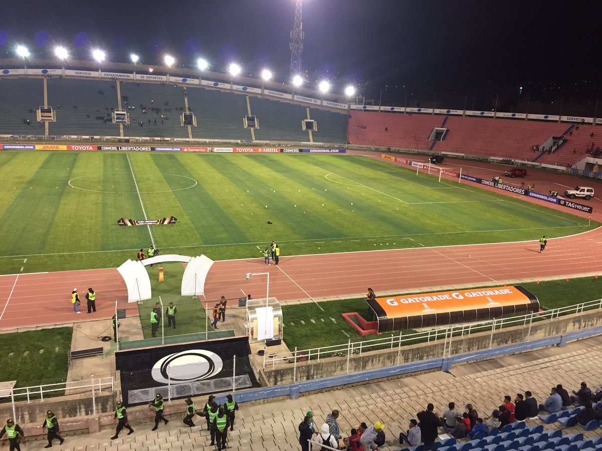 A menos de uma hora para a bola rolar, estádio ainda bastante vazio. Lembrando que o Wilstermann é de Cochabamba, e não de Sucre. #trsucre