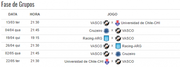 Confira a tabela de jogos do Vasco na fase de grupos da Libertadores