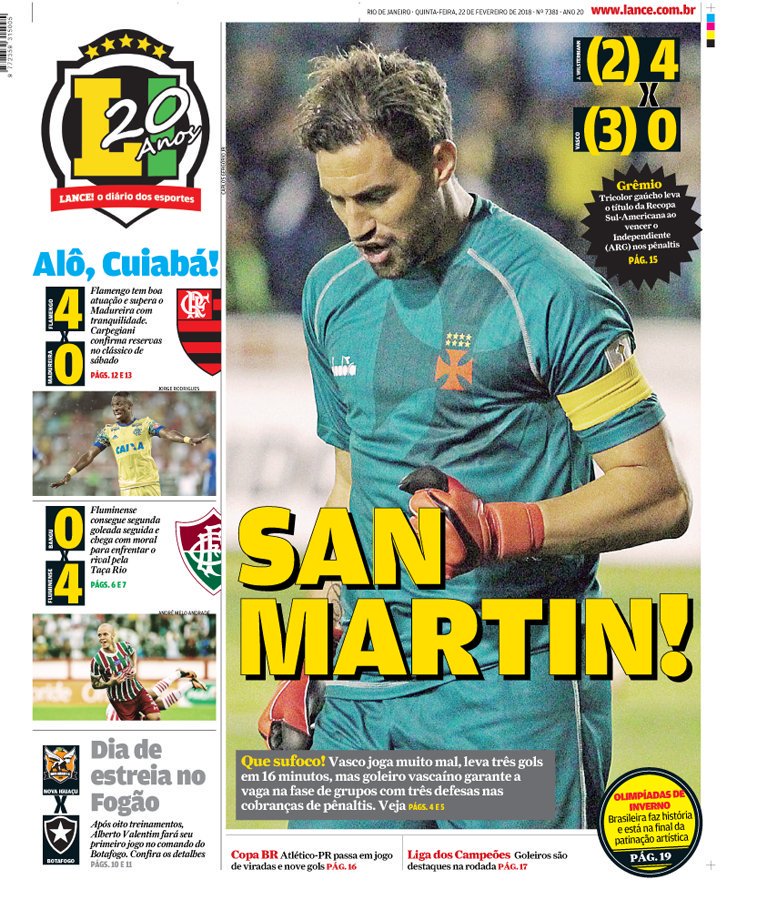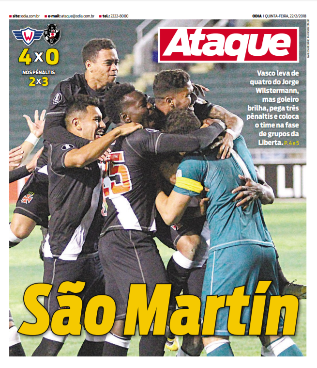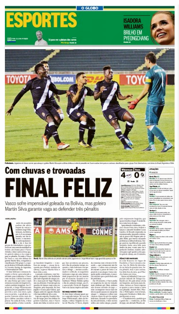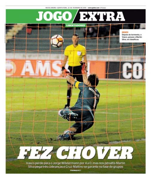 No jogo de volta da 3ª fase preliminar da Libertadores da América, o Vasco foi derrotado pelo Jorge Wilstermann por 4 a 0 na noite de 4ª-feira em Sucre, na Bolívia. Porém, nos pênaltis, o Gigante da Colina venceu por 3 a 2 - com Martín Silva defendendo três penalidades - e garantiu sua vaga na fase de grupos da competição.