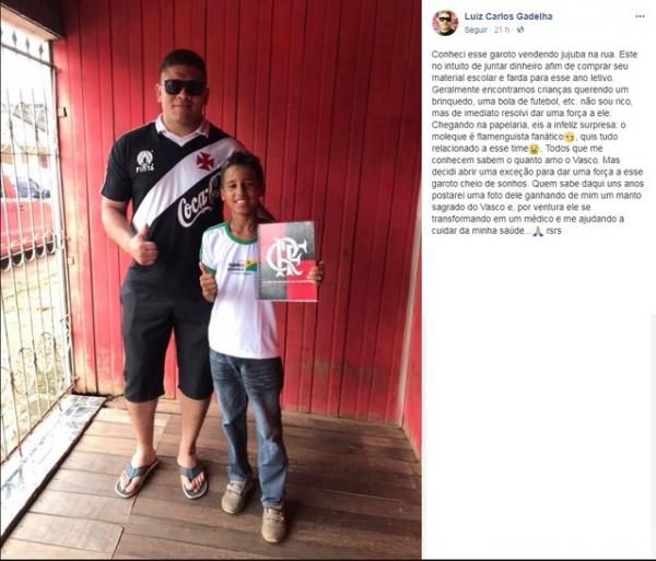 Quando você ouvir a expressão sem clubismo', lembre-se desta história. O policial militar Luiz Carlos Gadelha, 30 anos, é torcedor fanático do Vasco. Há uma semana, ele estava em uma loja de eletrodomésticos no Segundo Distrito de Rio Branco, capital do Acre, quando foi abordado por um garoto, de 11 anos, que vendia doces com o intuito de conseguir dinheiro para ajudar na compra do material escolar dele e dos irmãos (cinco ao todo).