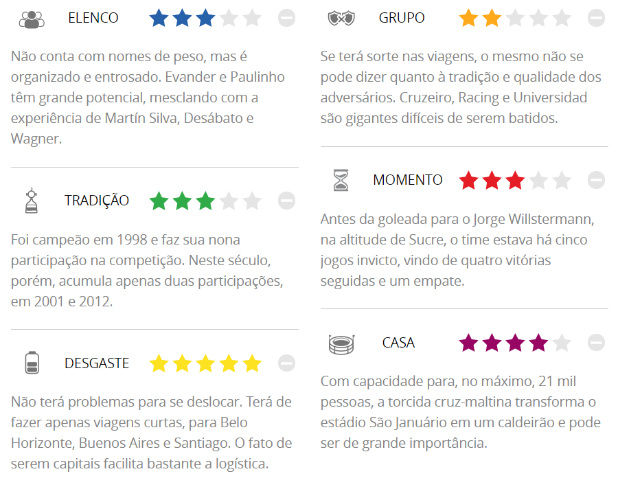 Tudo indicava que fosse avançar sem sustos para a fase de grupos, mas passou sufoco contra o Jorge Willstermann e quase caiu. O time está entrosado e pode fazer uma campanha digna, mas é preciso saber se a tensa partida contra os bolivianos abalou a confiança do grupo.