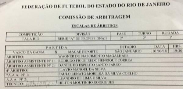 Árbitro de @VascodaGama x @sigamacae pela primeira rodada da Taça Rio, nesta quinta-feira. O jogo foi adiado por causa de compromisso vascaíno na Copa Libertadores da América.